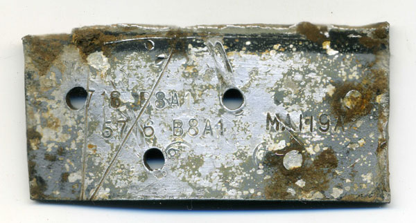 Historians Ken Reast, Albert Pritchard and Eric Barton located small surface remains at the crash site in 2007 with permission from the landowner, thus confirming the location. The item shown above shows a Halifax part number and is one of a number collected by Eric Barton at various sites that I was given by his son to re-house.