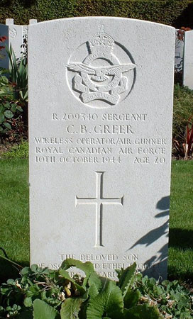 Wireless Operator / Air Gunner - Sgt Clifford Barton Greer RCAF (R/209340), aged 20, of Cobourg, Ontario, Canada. Buried Harrogate Stonefall Cemetery, Yorkshire (G/B/15). Recovered 28th October 1944.