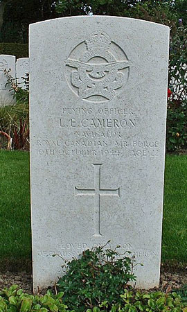 Navigator - F/O Laurence Emmett Cameron RCAF (J/39328), aged 22, of Verdun, Quebec, Canada. Buried Harrogate Stonefall Cemetery, Yorkshire (G/B/14).