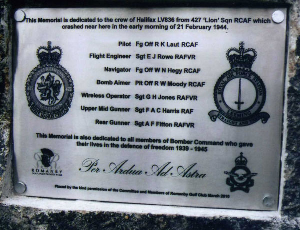 A memorial to this crew was dedicated near the crash site and within the grounds of Romanby Golf and Country Club in March 2010. It was through the efforts of club member Mr John Whitfield that the memorial came about.