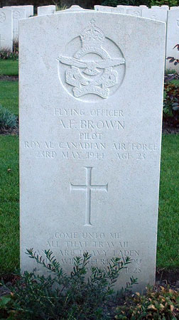 Pilot - F/O Alan Francis Brown RCAF (J/25827), aged 23, of Winnipeg, Manitoba, Canada. Buried Harrogate Stonefall Cemetery, Yorkshire (B/D/3).