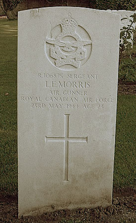Air Gunner - Sgt Lawrence Edward Morris RCAF (R/106875), aged 23, of Murrayville, British Columbia, Canada. Buried Harrogate Stonefall Cemetery, Yorkshire (B/D/1).