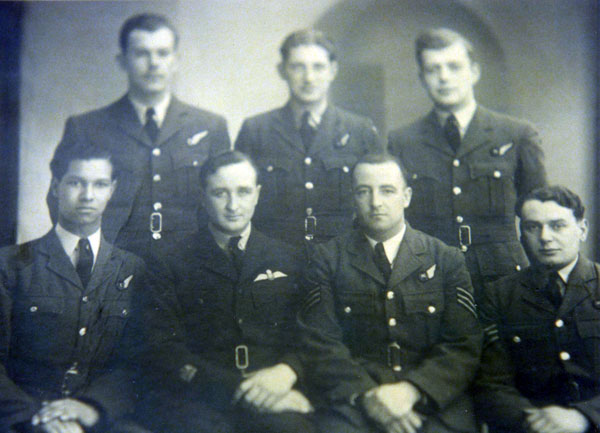 The crew of Halifax LW140. Back row (L-R): Hillrich, Downs, Lillington. Front row (L-R): Florent, Jekyll, Rodger, Catterwell. A copy of this photograph forms a small memorial to the crew within Goxhill Church, East Yorkshire.