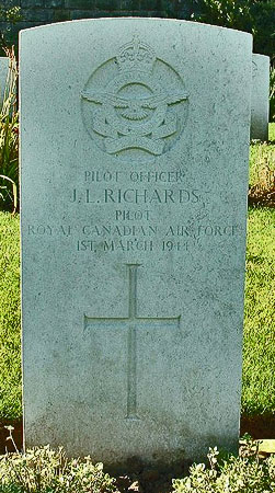 Pilot - P/O James Leonard Richards RCAF (J/19978), aged 23, of St.John, New Brunswick, Canada. Buried Harrogate Stonefall Cemetery, Yorkshire (F/B/13).