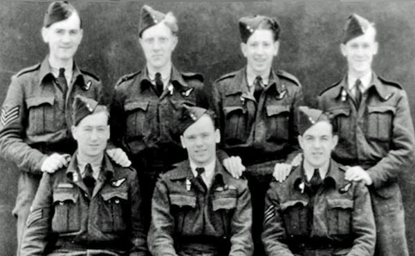 The crew of Halifax MZ286. Photograph via the late Eddie Fell. Back row L-R Fee, Johnson, Burgess, Emery. Front L-R Bishop, Monnier, Montgomery.