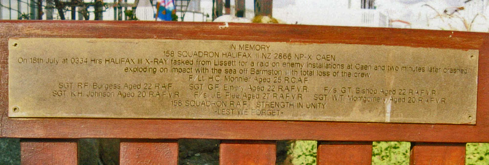 Two minutes after becoming airborne MZ286 struck the sea at Barmston with the port wing first and broke up. The primary cause of the accident was considered to be the temporary loss of control of the aircraft by the pilot, it had almost certainly also been effected by turbulence in the vicinity of the coast but because it was flying lower than the others had no height margin. An explosion on impact destroyed the aircraft and all on board were sadly killed. The aircraft had crashed just below the high water mark. Over the days that followed the bodies of all the crew were recovered. While I do not include flying accidents at sea on this website this incident occurred on what was technically land for part of the day. I strongly suspect that coastal errosion since 1944 has effected where the site now lies and it is probably beyond the low water level and very much out to sea. A memorial bench within Park Resorts Caravan Park commemorating the accident was created in August 2005.