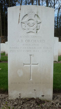 Anthony Orchard was born on 15th February 1924 at Llandudno, Wales and was the son of Victor Stanley and Ellen Mary (nee Hattatt) Orchard. He and his family appear to have moved to Canada in the late 1930s. He worked for his father as a tailor's assistant before becoming a machinist and later working as an inspector of aircraft parts for the Bata Show Co (Munitions Division). He enlisted for RCAF service on 26th September 1942 and after training in Canada he was awarded his air navigation flying badge and a commission on 15th October 1943. On arrival in the UK he trained at 6 (O)AFU, 22 OTU and 1664 HCU before posting to 415 Squadron on 21st July 1944.