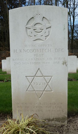 Harry Knobovitch was born on 13th January 1913 in Pinsk, Poland (now Belarus) and was the son of Iser and Itka (nee Lipska) Knobovitch (which is probably an Englishized version the surname). His parents also had two other sons and a daughter and the family moved to Montreal, Province of Quebec, Canada around 1930, probably after his father had seen what was happening with the worsening Jewish situation there. In 1941 there was a massacre of upto 11,000 Jewish men of Pinsk and in 1942 all the remaining Jewish population were killed. This was a fortunate foresight by his parents back in 1930 to leave Pinsk. Harry attended school in Montreal and was working as a bookkeeper for his father when he enlisted into the RCAF in Montreal on 26th June 1942. He trained as a pilot, receiving his Pilot's Flying Badge on 27th July 1943 and a commission on the same date. He then arrived in the UK later in the year and trained at 21 (P)AFU, 1511 B.A.T.Flight, 22 OTU and 1664 HCU, being posted to 415 Squadron on 21st July 1944. As stated he died on 2nd November 1944 and was twenty one years old. He was awarded the DFC after his death and notification appeared in the London Gazette on 19th December 1944, the citation his DFC reads.. "This officer participated in many sorties and has set a fine example of skill and devotion to duty. One night in October 1944, he piloted an aircraft detailed to attack Duisburg. Long before the target was reached one engine failed completely. Undeterred Flying Officer Knobovitch continued his mission and a good bombing attack was made. When crossing the coast of France on the return flight, the wireless apparatus caught fire. The aircraft quickly became filled with smoke. Displaying great coolness Flying Officer Knobovitch directed the efforts of two crew members in extinguishing the flames. This done, he cleared the smoke out of the aircraft by turning on the heater of the defective engine. He afterwards flew the damaged aircraft to base and effected a safe landing in difficult circumstances. This officer displayed great skill and determination and provided a most inspiring captain.”