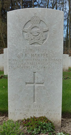 James Harper was born on 13th January 1924 in Fort William, Ontario, Canada and was the son of Lawrence Russell and Maude Isobel (nee McMillan) Harper. The family moved to Victoria, British Columbia in 1928. As a young man he worked as in a paint factory and as a car mechanic / garage attendant after leaving school. He enlisted for RCAF service in Vancouver on 25th August 1942 and after training was awarded his Wireless Operator / Air Gunner's badge on 23rd August 1943. He left for service overseas soon after and arrived in the UK on 19th September 1943, after training at 6 (O)AFU, 82 OTU and 1666 HCU he was posted to 415 Squadron on 21st July 1944. He received a backdated commission after his death to 1st November 1944.