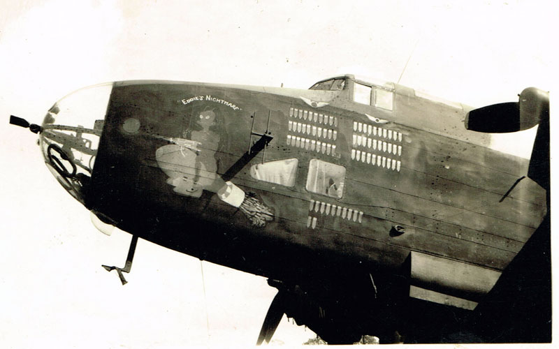 During the 5th September 1944 this 415 Squadron aircraft was returning to base of East Moor having landed at Shepherd's Grove following an operational flight to bomb Volkel airfield in Holland on the night of 3rd / 4th September. On landing at East Moor the tail struck the ground which fractured the tail wheel mounting. The aircraft then bounced but it was brought under control and landed keeping the tail off the ground as far as could be helped. Minor Cat.A(c)/FA damage was recorded and it was repaired. The probable crew were involved in this landing accident at East Moor were as follows; they had flown the operational flight the night previously. Halifax MZ603 is believed to be shown in the photograph shown above and carried the nose art "Eddie's Nightmare".