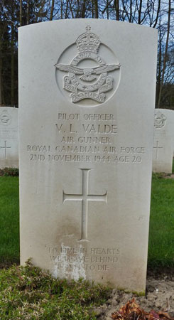 Victor Valde was born on 20th September 1924 and was the son of Lewis and Emma Valde, of Transcona, Manitoba, Canada. Prior to enlisting into the RCAF Victor Valde had worked for "The Red and White Store" and Western Steel Products. He enlisted for RCAF service on 20th January 1943 in Winnipeg and after training in Canada he was awarded his air gunners' flying badge on 23rd December 1943. On arrival in the UK he trained at 22 OTU before posting to 415 Squadron on 21st July 1944. He was involved a number of aircraft that sustained flak damage while serving with 415 Squadron at East Moor and the crash of Halifax MZ686 near East Moor airfield. Having received a commission on 13th September 1944 P/O Victor Valde was killed on 2nd November 1944 flying in Halifax MZ603 on Ops to Dusseldorf. He was twenty years old and is buried in Rheinberg War Cemetery, Germany. Valde Avenue in his home town was named in his honour.