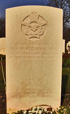 Malcolm Buchanan was born on 28th December 1912 at Gympie, Queensland, Australia and enlisted for RAAF service in Brisbane on 8th November 1941. After basic training in Australia he left for service overseas on 13th December 1942. On arrival in the UK he trained at 2 (O)AFU, 1538 BAT Flight, 10 OTU and 1658 HCU before posting to 78 Squadron. On 18th July 1944 he, James Rice and James McCannon were flying Halifax MZ788 on an operational flight to bomb a flying bomb site at Acquet. During the flight the Halifax was hit in the cockpit area by flak which injured their then flight engineer. A fire broke out within the fuselage and three other members of their crew baled out over the sea and were lost. Malcolm Buchanan was slightly injured but was able to fly the aircraft back across the English Channel and landed at West Malling but overshot on landing as the braked failed. Buchanan was awarded an immediate award of the DFC while his then flight engineer received a CGM. The flight in which he was killed in November 1944 was to have been his final operational flight of his Tour after which he was to have been screened.