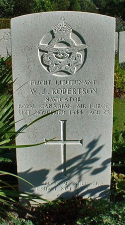 Navigator - F/Lt Wilbert James Robertson RCAF (J/20244), aged 25, of Edmonton, Alberta, Canada. Buried Harrogate Stonefall Cemetery, Yorkshire (H/C/10).