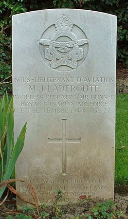Michael Laderoute was born on 26th February 1922 at Montreal, Quebec, Canada and was the son of Michael and Jane Isabel (nee Reddington) Laderoute. Unfortunately his father died in 1929. He was still at high school when he enlisted for RCAF service on 1st July 1940 in Montreal. After training in Canada he was awarded his air gunner's flying badge on 15th February 1941. He left for service in the UK in April 1941 and following training at No.2 Radio School (Wireless Operator training) and 12 OTU he was posted to 99 Squadron on 26th August 1941. In October 1941 he was posted to 15 OTU in preparation to be posted to the Middle East. He served in the Middle East from October 1941 until October 1942 with 109 Squadron and then 162 Squadron. For service in the Middle East he received a Mention in Despatches on 11th June 1942. Returning to the UK he served at 22 OTU (as an instructor) until November 1943 receiving a commission on 26th October 1943. In November 1943 he was allowed to return to Canada on compassionate grounds because of family matters. While in Canada he served at 34 OTU until April 1944. He then returned to the UK in June 1944 and after training at 1659 H.C.U. he was posted to 434 Squadron on 19th August 1944. While qualified as a wireless operator / air gunner he served as an air gunner at 434 Squadron.