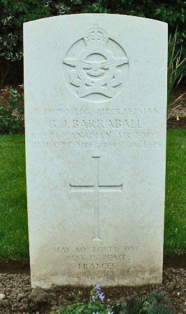 MT Driver - LAC Gordon James Barraball RCAF (R/271290), aged 25, of Bowmanville, Ontario, Canada. Buried Harrogate Stonefall Cemetery, Yorkshire (E/D/14).
