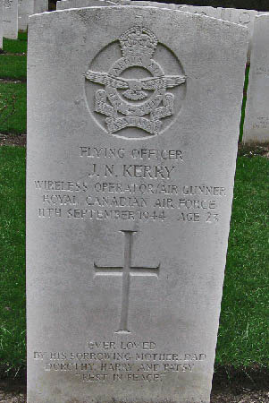 Wireless Operator / Air Gunner - F/O John Nicholas Kerry RCAF (J/37220), aged 23, of Toronto, Ontario, Canada. Buried Brookwood Cemetery, Surrey (55/B/5).