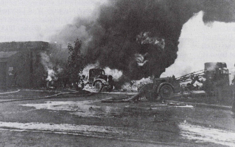 At 16.01hrs on 11th September 1944 this 408 Squadron aircraft took off from Linton on Ouse airfield to undertake an operational flight to attack a target at Castrop-Rauxel. While outbound, around an hour into the flight, the aircraft's starboard outer engine failed over The Wash. The crew opted to return to base and jettisoned the bomb load in the North Sea. At 18.24hrs they attempted to make a landing at Linton on Ouse airfield but their line on the runway was not good so the pilot opted to overshoot, immediately after pulling up from the landing run the starboard inner then failed and with power being applied to the good engines on the port side the aircraft began to swing to starboard. With wheels and flaps down and with a low airspeed the aircraft stalled and side-slipped into the ground, it just missed striking a hanger before crashing into the M.T. vehicle section on the edge of the airfield. The aircraft burst into flames damaging buildings and vehicles, killing five of the crew and one of the M.T. drivers. Another member of the crew was taken to Northallerton Hospital where he died just over twenty four hours later. A further member of the crew escaped serious injury and two other M.T. drivers were injured. In total ten M.T. vehicles were also destroyed. The photograph shown above depicts part of the crash scene. I assume that there were various rescue attempts made to free the injured from the fires, those that are known are detailed below.