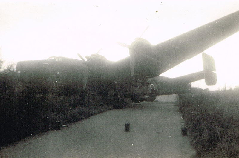 On the night of 15th / 16th of September 1944 this 432 Squadron aircraft was flown on an operational flight to bomb Kiel and took off from East Moor at 22.31hrs.The crew released their bomb load from 18,500 feet at 01.23hrs. During the course of the night it is believed that the aircraft was slightly damaged flak which damaged the hydraulics. On their return to East Moor at 04.31hrs the aircraft landed too far down the runway and too fast, because of the damage the brakes did not work properly and the aircraft overshot the runway. It came to a halt with it's undercarriage damaged after running through a ditch at the end of the main runway. The location of where this occurred is listed elsewhere as being at the southern end of the main runway and have run through the ditch that damaged a few other aircraft prior to this incident. Remarkably no major damage resulted and the damage was repaired. By this date work to fill in this ditch may have begun which limited the damage to overshooting aircraft. I was sent a photograph of a damaged Halifax at East Moor which is said to show Halifax NP722 after this mishap, I have always believed that this photograph was taken with the aircraft across the road at the northern boundary off other the end of the main runway. I could be wrong.