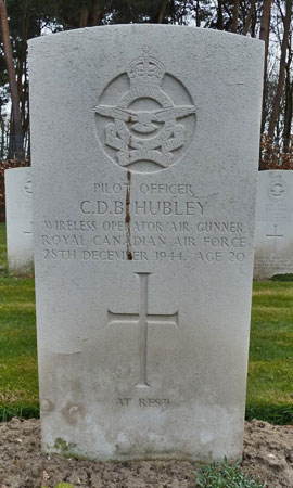 Cecil Hubley was born on 22nd March 1923 and was the son of James Dimmoc and Jeanne Barnett (nee Duncan) Hubley, of Manitou, Manitoba, Canada. When he left school he began working for his father on the family farm. He enlisted for RCAF service on 27th September 1941 in Winnipeg and trained as a wireless operator / air gunner in Canada before being awarded his Air Gunner's badge on 22nd February 1943. He arrived in the UK in November 1943 and then trained at 6 (O)AFU and 82 OTU before posting to 1666 HCU at Wombleton on 22nd May 1944. He and his crew were posted to 419 Squadron on 31st August 1944 and he received a commission on 13th November 1944.
