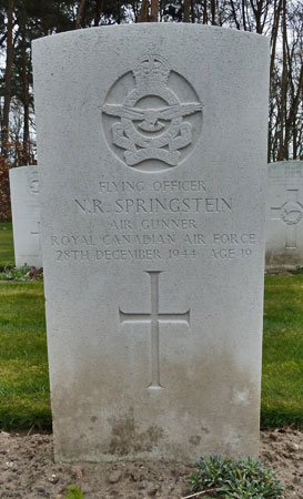 Norman Springstein was born on 4th January 1925 at Kerrobert, Saskatcehwan, Canada and was the son of Archibald Peter and Margaret Ella (nee Wilson) Springstein. The family later moved to Merid, Saskatchewan. His father had served in WW1 and the family were working in farming. he enlisted for RCAF service on 15th December 1942 and after training in Canada he was awarded his air gunner's flying badge and also a commission on 12th November 1943. Norman had two brothers who also served in the Canadian Forces in WW2. Springstein Lake in Saskatchewan is named in his honour.