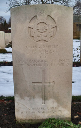 Pilot - F/O John Douglas Alfred East RCAF (J/36618), aged 20, of Keremeos, British Columbia, Canada. Buried Harrogate Stonefall Cemetery, Yorkshire (G/C/5).