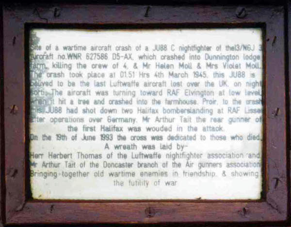 What is clear is that on the night of 3rd / 4th March 1945 the Luftwaffe carried out Operation Gisela which involved following a returning bomber force back to England, on return from bombing Kamen, and attacking them as they prepared to land. The tactics they used were very successful and a number of bombers were either badly damaged and crashed or sustained more minor damage. This aircraft is believed to have attacked at least one Halifax in the Elvington airfield area (AIR40/2421 states Pocklington airfield) before making a low level attack on a taxi using the Elvington to York road which ran parrallel with the runway at Elvington. The German aircraft clipped a tree and then the corner of Dunnington Lodge before crashing onto the road and disintergrating at around 01.50hrs. Sadly all four Luftwaffe crew were killed in the crash. Three occupants of the house were also seriously injured and all three died over the coming hours. This became the last German aircraft to crash on British soil during the Second World War. The crew may have been the one that had shot down Halifaxes NR179 and NR235 and was about to shoot down a third (Notelle in NR229) who took evasive action and flew off north but later crashed near Hurworth on Tees, Co.Durham. The bodies of the four Luftwaffe crew were initially buried at Fulford Cemetery, York but were later re-interred at Cannock Chase Cemetery, Staffordshire.