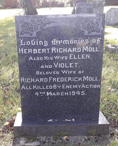 Civilian - Mrs Violet Moll, aged 28. (Daughter-in-law of the above couple). Died of injuries on 4th March 1945 at York Hospital. Buried St Nicholas Churchyard, Dunnington, York.