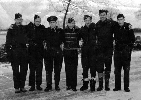 Left to right. Lightly, Wilks, Boehk, Reith, Sklar, Baker and Johnson (all RCAF). They later went on to serve with 426 Squadron. This photograph is taken from Richard Koval's 6 Group website "www.rcaf.com/6group" and is supplied through Mr D Nicholson, nephew of F/Sgt Johnson.