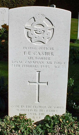 Bomb Aimer – F/O Frederick Einar Casher RCAF (J/37805), aged 23, of Vancouver, British Columbia, Canada. Buried Harrogate Stonefall Cemetery, Yorkshire (G/G/10). Died of injuries on 24th February 1945.