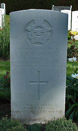 Pilot – F/Lt Peter Franklin Robb RCAF (J/5118), aged 23, of Toronto, Ontario, Canada. Buried Harrogate Stonefall Cemetery, Yorkshire (G/G/7).