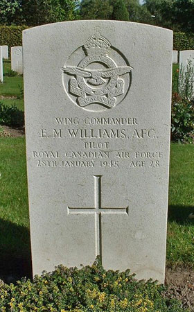 Edwin Williams was born on 9th January 1917 at Hong Kong and was the son of Ernest Alfred Mountfield and Lilian Dillon (nee Smith) Williams. His father was probably an officer in the British Army and the family later settled in British Columbia, Canada. Edwin was educated at one of the finest schools in Canada at Brentwood College, British Columbia. After leaving school he was offered a place at the Royal Military College where he studied engineering. He was granted a commission in the RCAF in June 1939 and after training was awarded his Pilot's Wings in October 1939. His first operational posting was to No.11 Bombing and Reconnaissance RCAF Squadron where he undertook anti-submarine patrols, in June 1941 he was posted to No.10 (B.R.) RCAF Squadron for the same anti-submarine work and for service with them he was awarded the Air Force Cross, Gazetted on 11th June 1942. Hugh Halliday has located the recommendation for his AFC which stated that.. "During 1,077 hours of flying, 639 of which were on actual war flights, this officer from No.10 (BR) Squadron has contributed excellent and extremely valuable work on convoy patrols and reconnaissance duties, carrying out 187 sorties over the North Atlantic. This officer is the outstanding pilot of his squadron, and for his devotion to duty, and the fine example he has set to others in his class, I strongly recommend him for the award of the Air Force Cross." He was next posted to 145 (B.R.) RCAF Squadron where he rose to Commanding Officer and took a main part in instructing new crews there for which he was recommended for OBE on 28th October 1942 but no action seems to have been taken. After 145 Squadron he was posted down the Staff Officer route and away from operational flying units. He served at the Eastern Air Command HQ and having risen to W/Co in October 1943 would train at the RCAF War Staff College in preparation for heading overseas to command an operational squadron. While in Canada he married in 1942 and left a young child. He arrived in the UK in June 1944 and over the coming months trained at 3 (P)AFU, 22 OTU and 1659 HCU before posting to 424 Squadron on 30th December 1944.