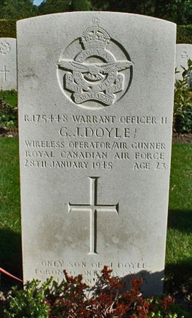 Wireless Operator / Air Gunner - P/O Gordon James Doyle RCAF (J/94756), aged 23, of Toronto, Ontario, Canada. Buried Harrogate Stonefall Cemetery, Yorkshire (H/F/3).