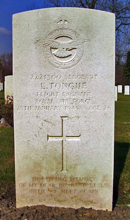 Flight Enginer - Sgt Leslie Tongue RAFVR (2221300), aged 26, wife of Willesden, Middlesex. Buried Harrogate Stonefall Cemetery, Yorkshire (H/F/1).