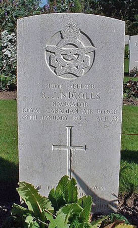 Navigator - P/O Robert James Nicolls RCAF (J/94159), aged 28, of Toronto, Ontario, Canada. Buried Harrogate Stonefall Cemetery, Yorkshire (H/F/4).