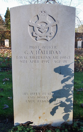 Bomb Aimer - P/O George Alan Halliday RAAF (427322), aged 28, of Collie, Western Australia. Buried Harrogate Stonefall Cemetery, Yorkshire (H.J.12).
