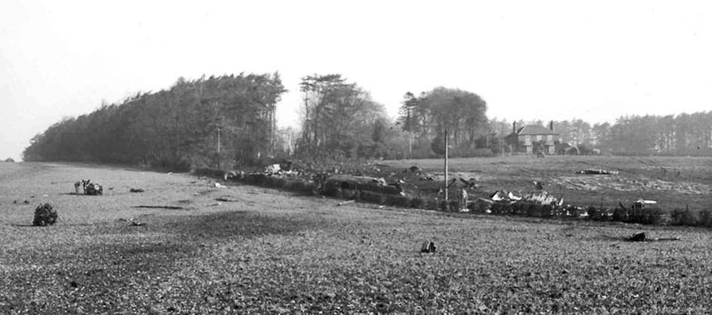 On the night of 8th / 9th April 1945 the crew of this 466 Squadron aircraft took off from Driffield airfield at 19.46hrs to undertake an operational flight to bomb Hamburg. On their return to Yorkshire many of the squadrons based in the county had trouble locating their bases because of thick fog. This aircraft had probably managed to return to the landing circuit of Driffield using the various forms of electronic navigation the aircraft carried at the time but in letting down through the cloud at 01.15hrs the aircraft flew into a small wood that surrounds Kirkburn Grange Farm, Tibthorpe and disintergrated. Sadly all on board were killed. Strangely the CWGC database lists some of the dates of death of members of this crew as being on 8th April 1945 and also some on 9th April 1945 which would suggest that some had died prior to the aircraft returning to the skies of Yorkshire (or it's probably just an error on the part of CWGC). The photograph above shows the crash scene looking back towards the direction the aircraft flew in from with the hole in the trees made by the aircraft. A memorial was erected close to the crash site in 2020 during the first Covid-19 lockdown but owing to restrictions imposed a dedication did not take place.