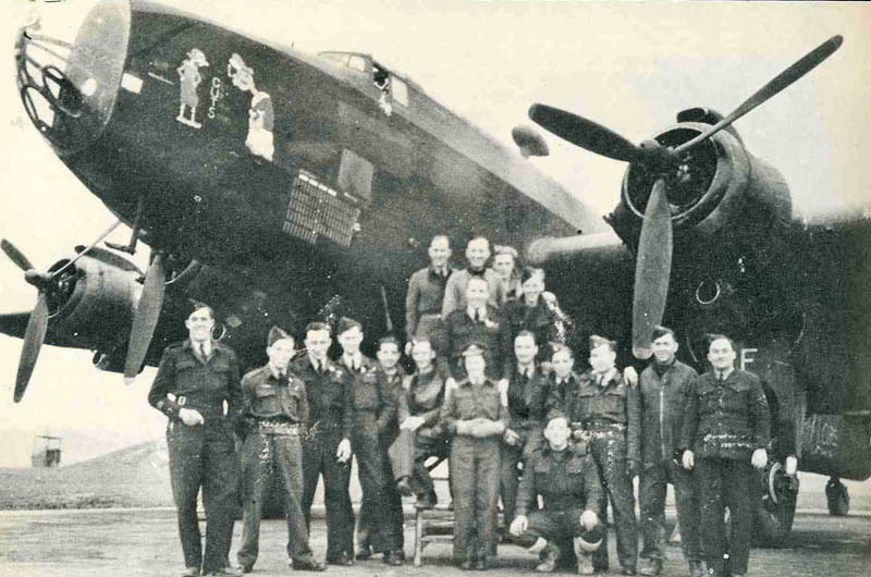Halifax LW172 had completed 97 operational flights and carried the nose art of "Get Up Them Stairs" (/ "G.U.T.S.") with the Popeye and Olive Oil characters. It is seen here with a large group of air and ground service men and women (not the crew of LW172 when it crashed at Kirkburn Grange).