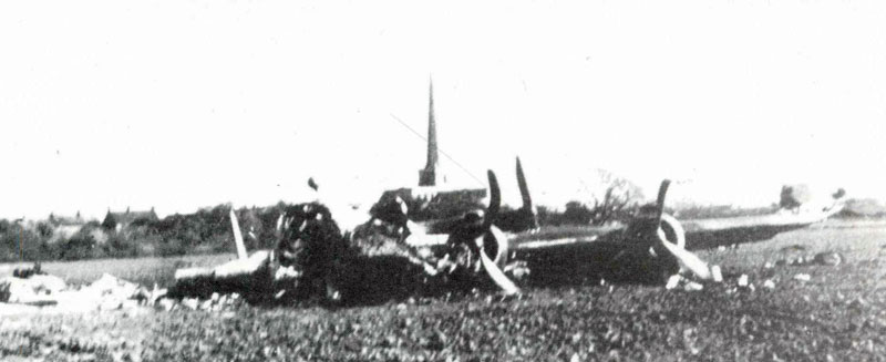On 5th April 1945 the crew of this 1658 Heavy Conversion Unit aircraft took off from Riccall airfield at 13.45hrs with the crew undertaking a training flight. Soon after leaving the ground both starboard engines cut out and then caught fire. The pilots or flight engineer could not then feather the engines so ten minutes after leaving the ground the instructor made a belly landing in a field just west of Hemingbrough at 13.55hrs. The crew escaped injury and got clear of the aircraft before the fire spread to the fuselage. The National Archives hold the AIB report for the incident within "AVIA5/24" which I have yet to read but would indicate a technical problem caused the incident. The site location is pretty obvious even today because of a widely published photograph that show the crashed aircraft in the field with Hemingbrough church in the background. To confirm whether anything remained in the field Eric Barton, Albert Pritchard, Eric Barton and Ken Reast sought permission from the landowner and located small fragments on the surface of the field in August 2002 to confirm the location.
