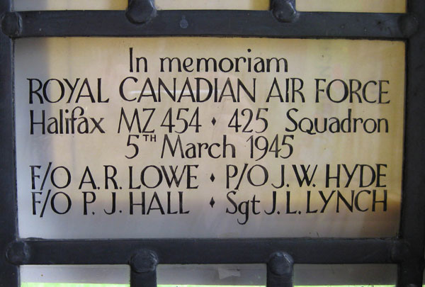 In the late afternoon of 5th March 1945 severe weather conditions were effecting flying over Yorkshire and these conditions were not forcast prior to a number of aircraft taking off for operational sorties to bomb Chemnitz and many aircraft iced up just after leaving their home airfields. Halifax MZ454 took from Tholthorpe at 16.40hrs and twenty minutes later it was returning to base suffering from these icing conditions when it crashed close to Little Ouseburn church. A crash investigation found in the National Archives on all the accidents on this night refers in brief to the accident at Little Ouseburn, it states that "this aircraft had crashed in a shallow dive as it had cut sideways through some trees. Here also was a deep crater where the bomb load had exploded. Only one whole engine was found, the parts of the others were located. There was no sign of fire on this engine at all but every sign of sufficient lubrication." Four of the crew were killed but three survived after baling out at low level just before the aircraft struck the trees. The exploding bomb load caused the severe damage to the nearby church but it was later repaired and a memorial stained glass window in the church porch was installed in 1995.