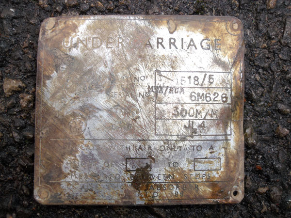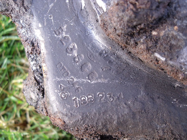 In November 2010 Ken Reast, Dick Barton and Albert Pritchard sought permission to enter the field from the landowners of the field shown above. The aircraft is known locally to have crashed in the small field between Moat Hall and Little Ouseburn church but little appears recorded locally with regard the events leading up to the aircraft exploding in this field. Later that month I was invited by them to come on with them on their visit to the land. A number of small pieces of the aircraft were located and after a series of telephone calls to other residents a large piece of one of the aircraft's engines was found in woodland through which the aircraft had flown through just prior to crashing. While we took this engine part away to clean up and photograph it was returned to the landowner and is preserved locally. I would like to thank (the now late) Hilary and Anne Gregory of Moat Hall for their assistance and patience and for allowing our visit. Hilary was unwell when we visited but was very helpful in assisting us, sadly he died shortly after our visit.