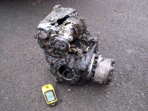 The piece of engine we found, photographed after gentle cleaning and with the hand-held Garmin GPS for scale.