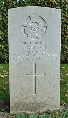 Jerome Epoch was born on 30th December 1924 at Kenilworth, Ontario, Canada and was the son of George Alphonsus and Teresa Jane (nee Tangney) Epoch. After leaving high school he worked as a lathe operator for a local company before enlisting for RCAF service on 7th September 1943. Having trained as an air gunner he was awarded his air gunners' flying badge on 7th April 1944. On arrival in the UK he trained at 86 OTU and 1666 HCU before posting to 420 Squadron on 24th December 1944. He appears to have received a commission after his death, back dated to 4th March 1945. His brother John served in the RCAF during WW2.