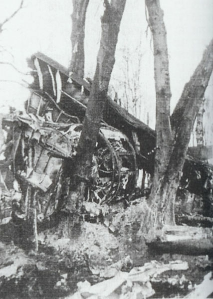 14th January 1945 this 415 Squadron aircraft swung on take off from East Moor at 15.53hrs for an operational flight to bomb the Grevonbrioch marshalling yards. It crashed into trees at the edge of East Moor airfield and caught fire. The crew survived although some suffered burns.