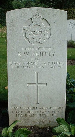 Pilot - P/O Kenneth William Griffey RCAF (J/92644), aged 20, of Hamilton, Ontario, Canada. Buried Harrogate Stonefall Cemetery, Yorkshire (H/G/16).