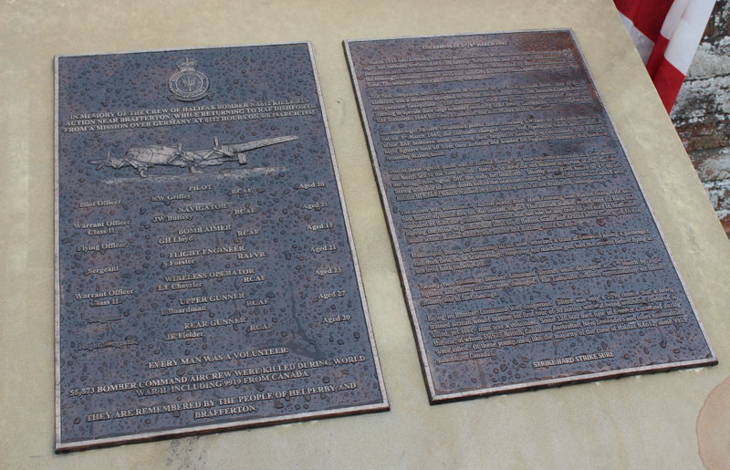 On 12th May 2013 a large memorial stone and plaque was dedicated in Brafferton to remember those who lost their lives in this incident, despite poor weather a large crowd of villagers were present to attend a short memorial service which was also graced the BBMF Lancaster in a fly-past. Unfortunately the original plaques, although made of metal, did not withstand the weather and less than five years later they were replaced. A re-dedication service took place on 4th March 2018.
