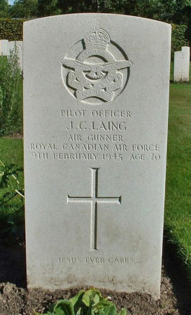 Air Gunner - P/O James Christopher Laing RCAF (J/94146), aged 20, of Peterboro, Ontario, Canada. Buried Harrogate Stonefall Cemetery, Yorkshire (H/G/1).