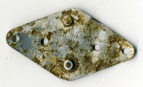 The most modern A1(M) road upgrade has just about destroyed the hedge line the aircraft first flew into but the field the aircraft broke up across and then exploded has escaped the developer. The end of the hedge line is still present running into the brand new motorway boudary towards the upper right of the photograph with the aircraft passing through it and into the grass field on the centre / left. Historians Eric Barton, Ken Reast and Albert Pritchard sought permission from the landowner and then located small fragments on the field surface in April 1999. The item shown below is one of the items Eric Barton retained and was passed to me to find a new home for in 2022. It contained a part number with the "57.." prefix indicating a Halifax part.