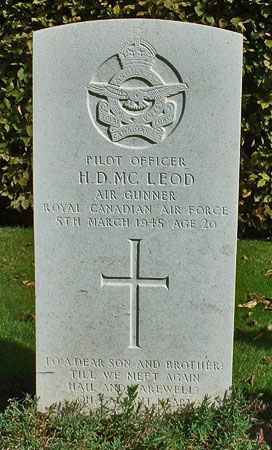 Air Gunner - P/O Harold Dick McLeod RCAF (J/94365), aged 20, of Toronto, Ontario, Canada. Buried Harrogate Stonefall Cemetery, Yorkshire (H/P/8).