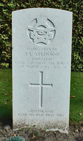 Navigator - F/O John Leslie Atkinson RCAF (J/35829), aged 32, of Calgary, Alberta, Canada. Buried Harrogate Stonefall Cemetery, Yorkshire (H/P/11).