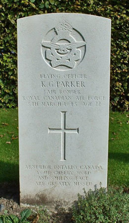 Bomb Aimer - F/O Kenneth George Parker RCAF (J/36081), aged 22, of Arnprior, Ontario, Canada. Buried Harrogate Stonefall Cemetery, Yorkshire (H/P/10).